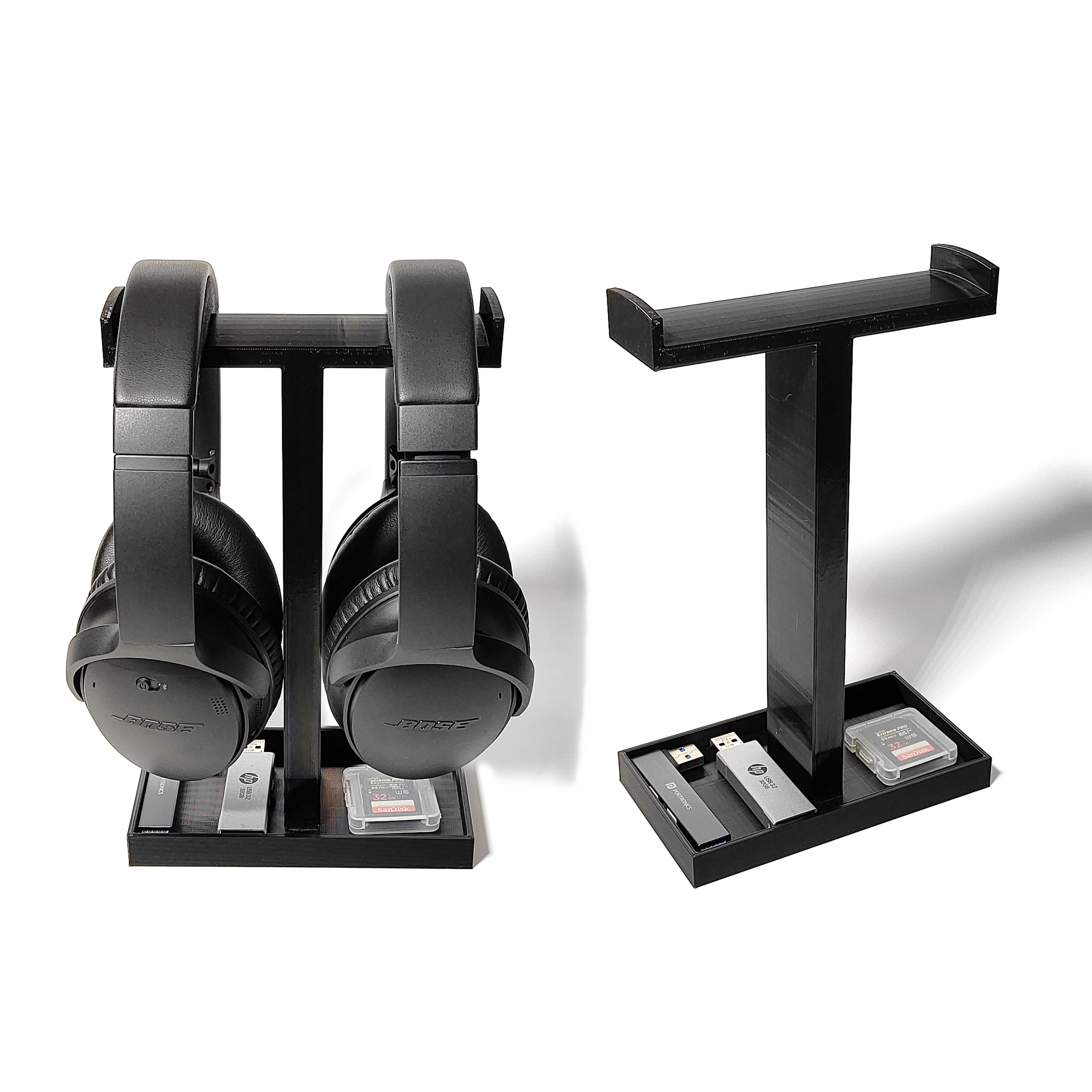 Desktop Stand for Dual Headphones/Headsets with Built-in Accessories Tray | Sleek Black Desktop Organizer for Home, Office, or Gaming Setup