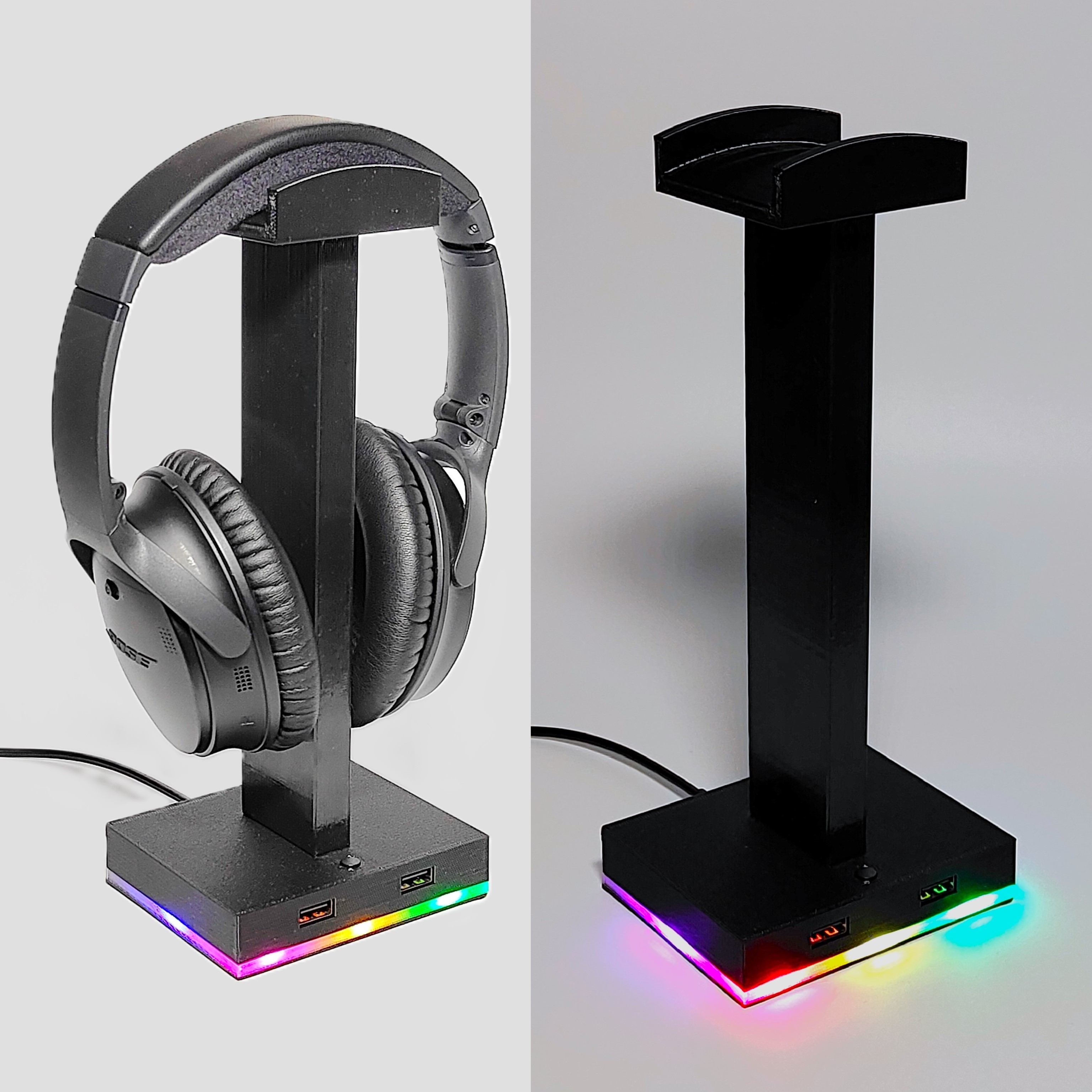 RGB Lighting Desktop Headphone Stand with RGB LED Illuminated Base & Vertical Arm, USB Ports | Microcontroller-Powered Dynamic Lighting Modes